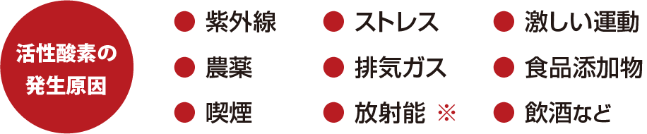 ※放射性物質は直接人体に悪影響を与える訳では無く、放射線をきっかけに体内で異常に増殖した「活性酸素」の影響が特に大きいといわれています。